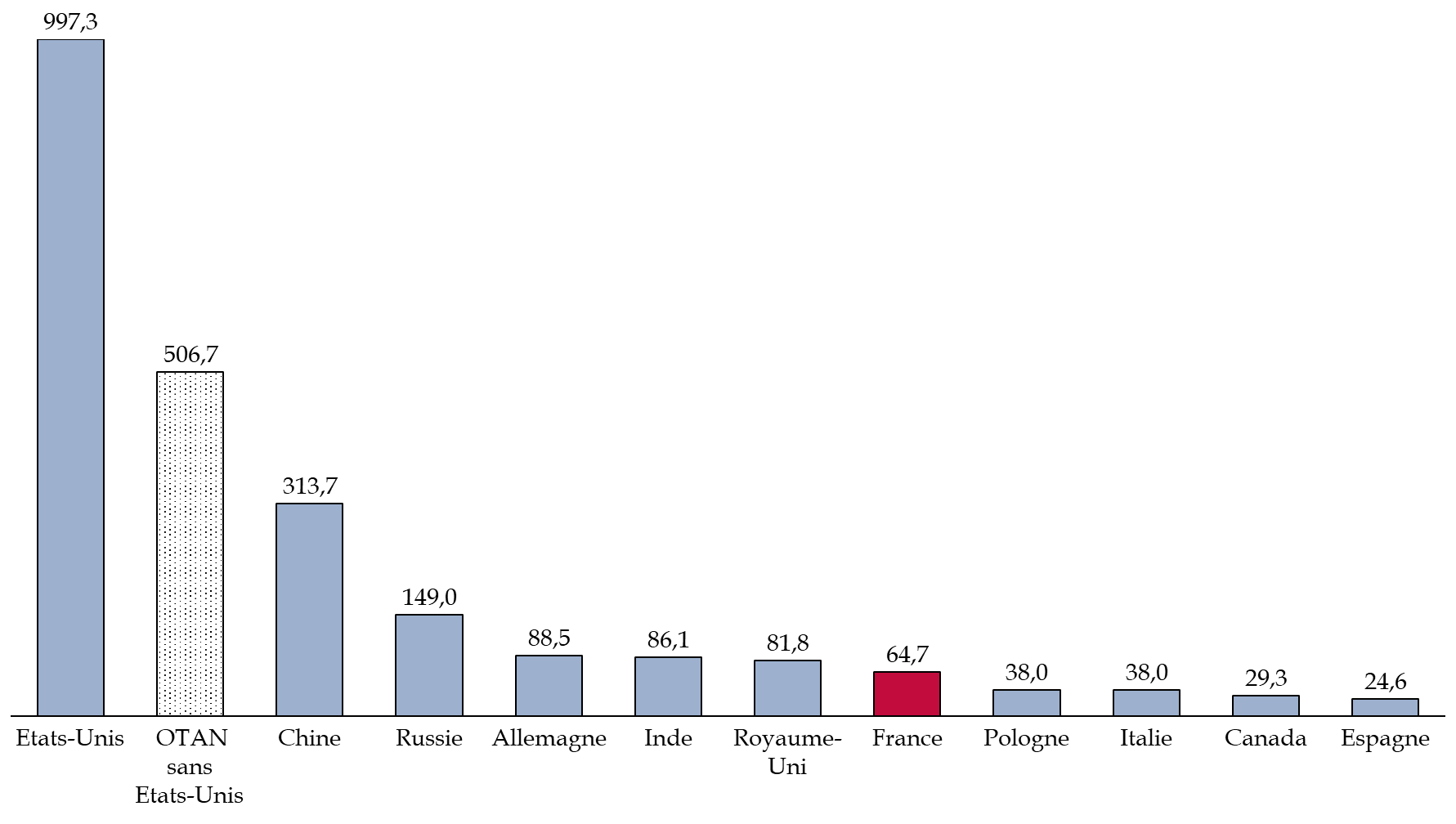 Note : l'ensemble des dépenses militaires sont ici prises en compte, y compris le CAS « Pensions » et des dépenses annexes à la mission « Défense », conformément à la méthodologie de l'OTAN.