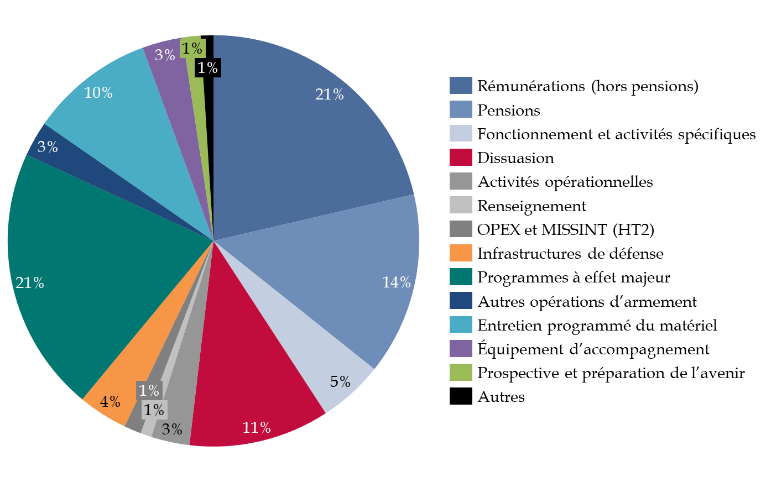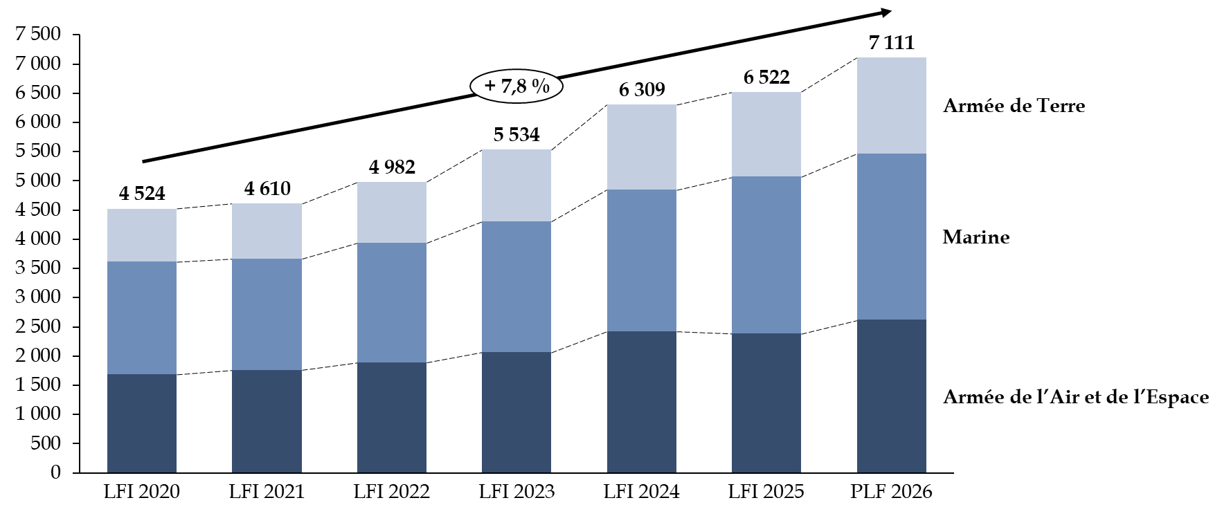 La hausse des crédits concerne l'ensemble des 16 « opérations stratégiques »2(*), à la seule exception des dépenses hors titre 2 pour les missions intérieures. La progression concernerait principalement les programmes d'équipements à effet majeur (+ 3,36 milliards d'euros), l'entretien des matériels (+ 609 millions d'euros), la masse salariale hors pensions (+ 552 millions d'euros), le fonctionnement et les activités spécifiques (+ 538 millions d'euros), la dissuasion nucléaire (+ 487 millions d'euros), et les infrastructures de défense (+ 152 millions d'euros). Par ailleurs, il est prévu l'acquisition de munitions (y compris complexes et téléopérées), pour un total de plus de 2,4 milliards d'euros en 2026.