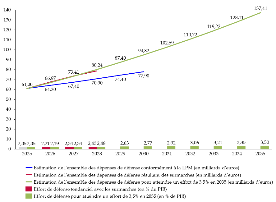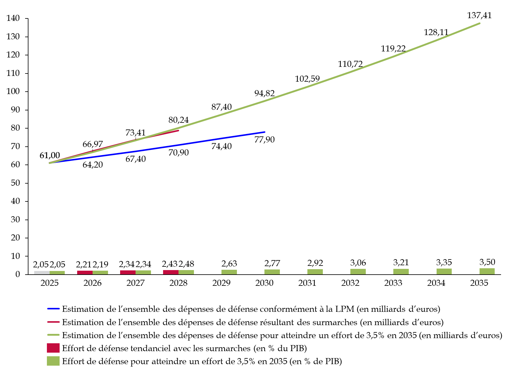 Cette dynamique est compatible avec l'atteinte de l'objectif d'un niveau de dépenses militaires de 3,5 % du PIB en 2035 - à condition de poursuivre l'effort chaque année (+ 0,15 % du PIB annuellement)1(*) -, soit un budget de l'ordre de 140 milliards d'euros à cet horizon.