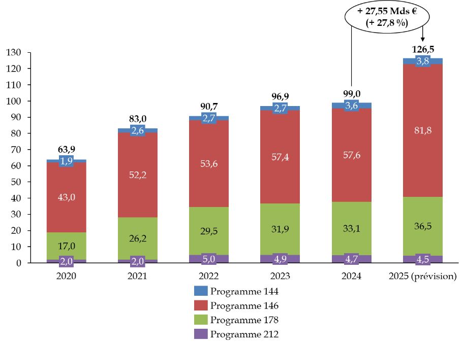 Cet effort important doit être salué, dans un contexte général d'efforts significatifs de redressement des finances publiques. La politique de défense constitue, en 2026, la deuxième politique publique de l'État en termes d'effort budgétaire en CP, après l'enseignement scolaire, et la première en AE. Sur le périmètre de la LPM (hors pensions), les crédits demandés s'établissent à 57,15 milliards d'euros, en hausse de 6,67 milliards d'euros par rapport à la LFI 2025. La mission « Défense » est ainsi celle qui enregistre la plus forte progression de crédits dans le PLF 2026.