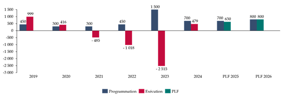 Source : commission des finances, d'après les données du rapport économique, social et financier annexé au projet de loi de finances pour 2026, de l'INSEE, de la trajectoire budgétaire prévue par la LPM 2024-2030, du projet de loi de finances pour 2026, et des réponses aux questionnaires du rapporteur spécial