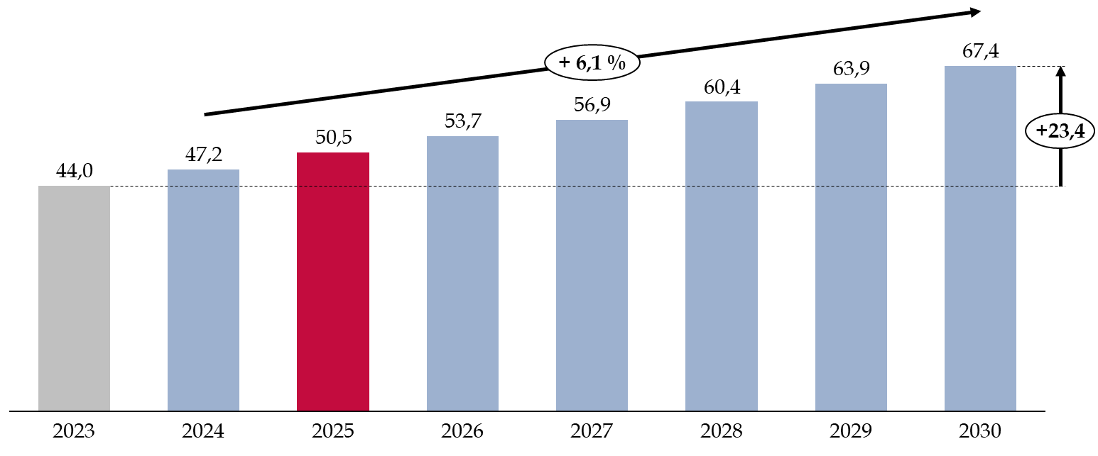 * 7 Les perspectives de financement des objectifs fixés par la loi de programmation militaire, rapport d'information n° 615 (2024-2025), déposé le 14 mai 2025, Dominique de Legge.