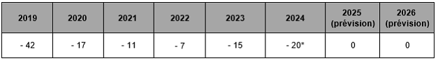 Note : le schéma d'emploi prévu en LFI 2024 était de - 15 ETP (puis - 5 ETP en 2025), mais il a été décidé en gestion de le porter à - 20 ETP.