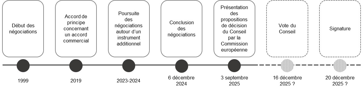 Face à l'opposition notamment exprimée par l'Autriche, l'Irlande, les Pays-Bas, la Pologne et la France vis-à-vis de cet accord, la présidente de la Commission européenne, Mme Ursula von der Leyen, a fait le choix du passage en force en concluant les négociations le 6 décembre 2024 à Montevideo, en Uruguay.