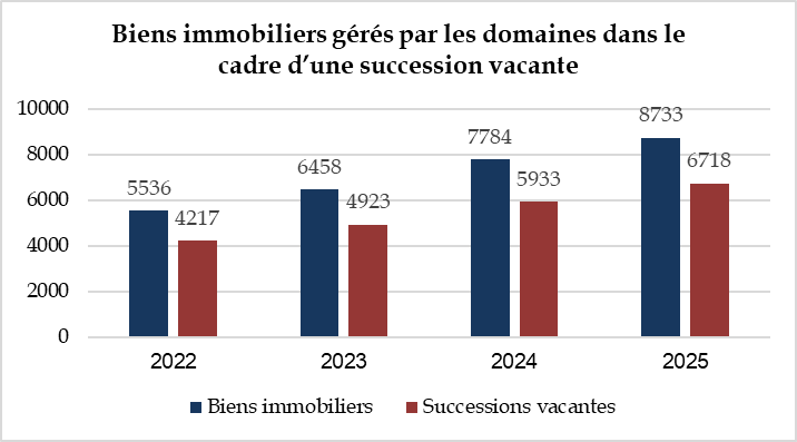 En parallèle, s'observe une hausse tendancielle des successions vacantes, liée, d'une part, à la structure démographique du pays, et, d'autre part, aux évolutions sociétales telles qu'une plus grande mobilité géographique et l'affaiblissement des liens familiaux. La Dnid est en outre confrontée aux mêmes difficultés d'identification et d'accord des indivisaires lorsqu'une succession vacante s'inscrit au sein d'une indivision.