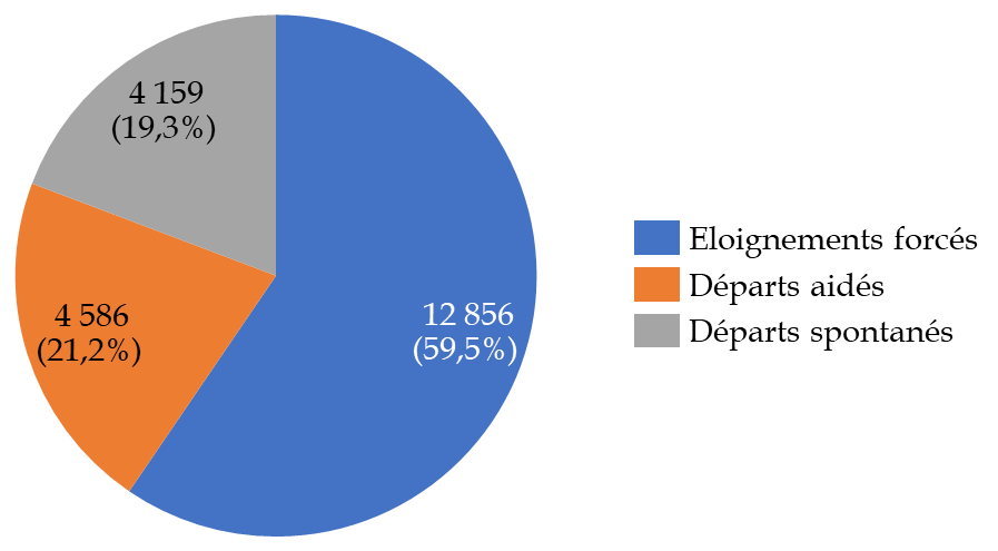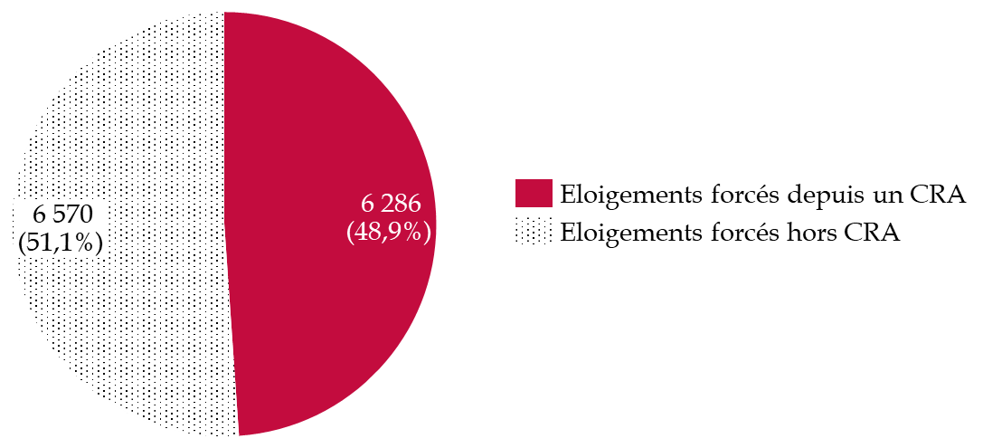 La rétention ne concerne qu'une fraction des étrangers visés par une mesure d'éloignement, mais demeure le moyen le plus sûr de les exécuter. En 2024, 12 856 éloignements forcés ont été réalisés en métropole, dont 6 286 à la suite d'une rétention, soit environ la moitié (48,9 %). La France est le pays de l'Union européenne qui procède au plus grand nombre d'éloignements forcés de ressortissants de pays tiers ces dernières années selon les données d'Eurostat, y compris en 2025 (7 375 au 1er semestre 2025, devant l'Allemagne).