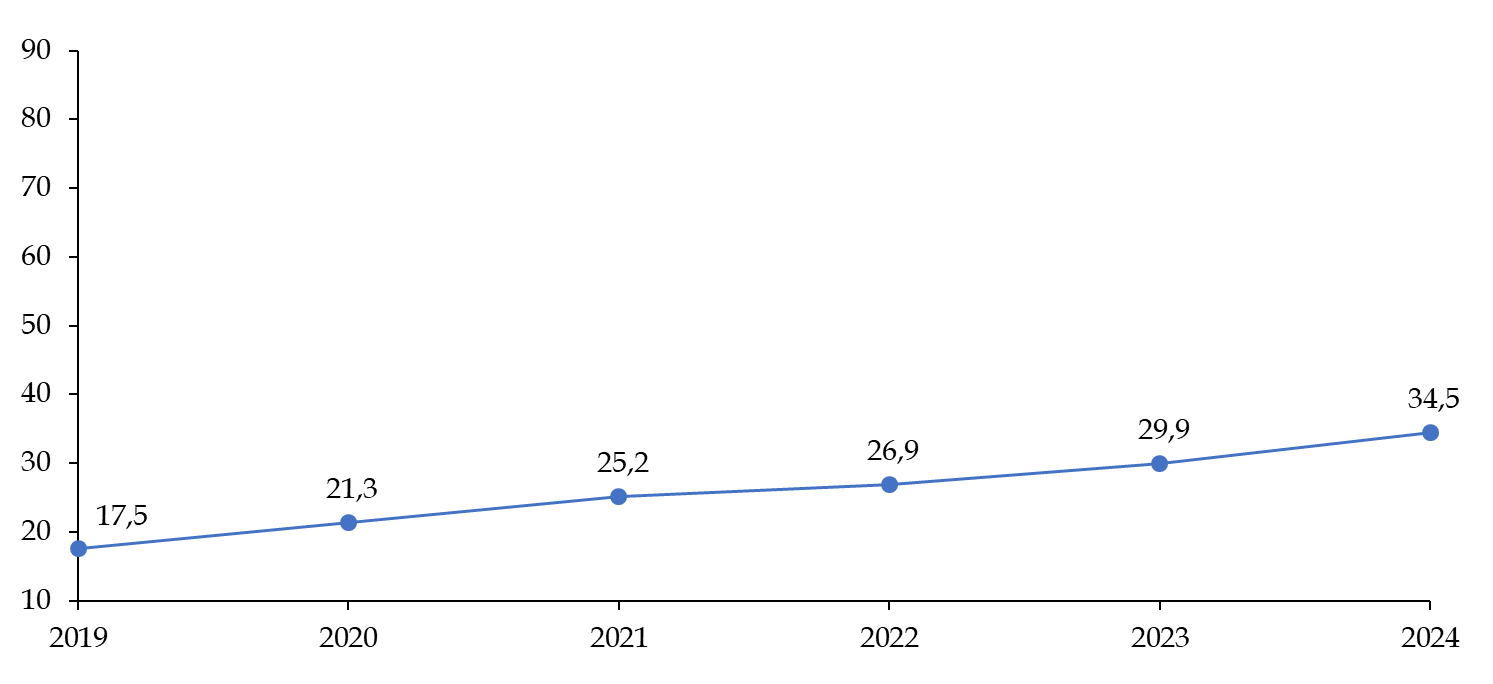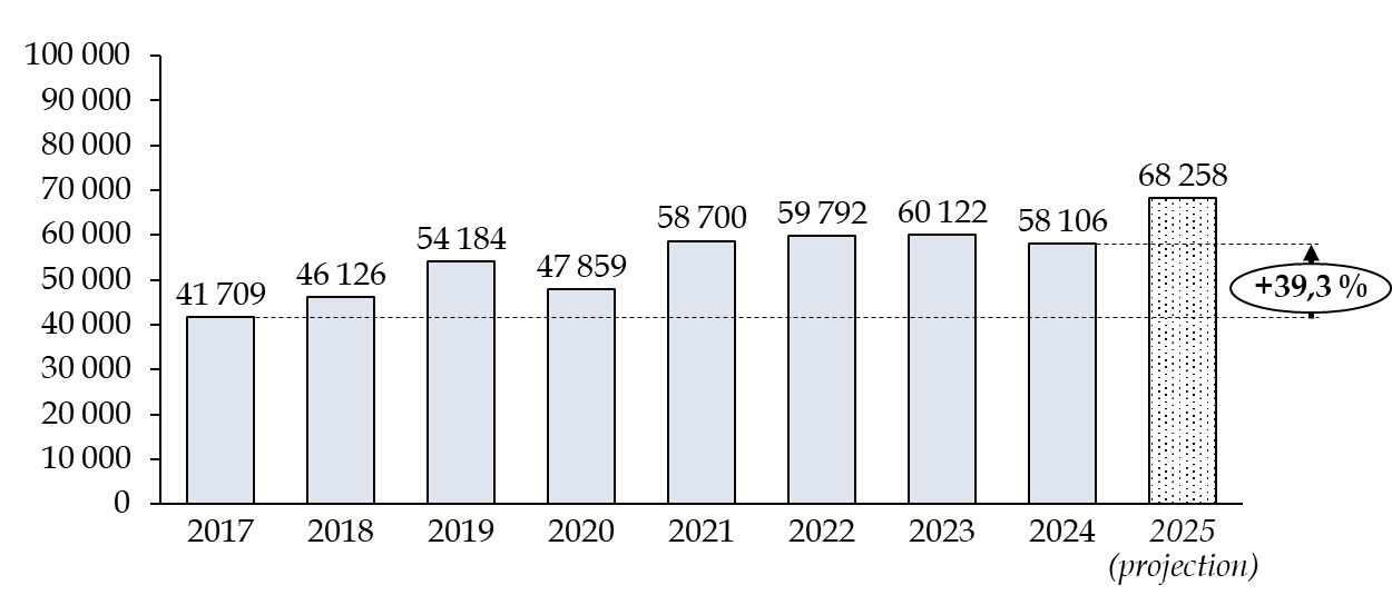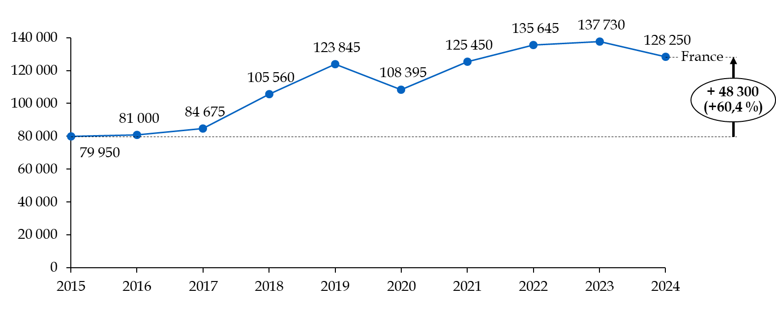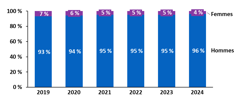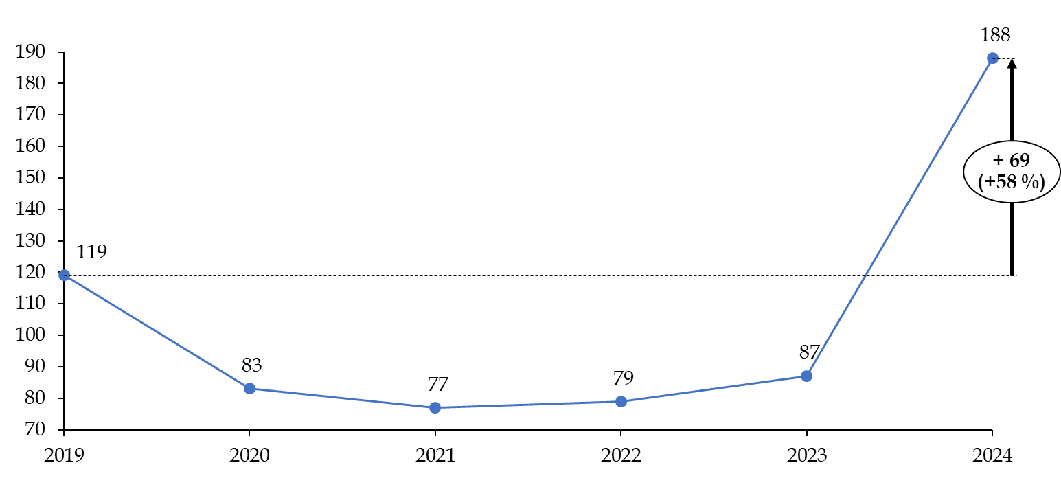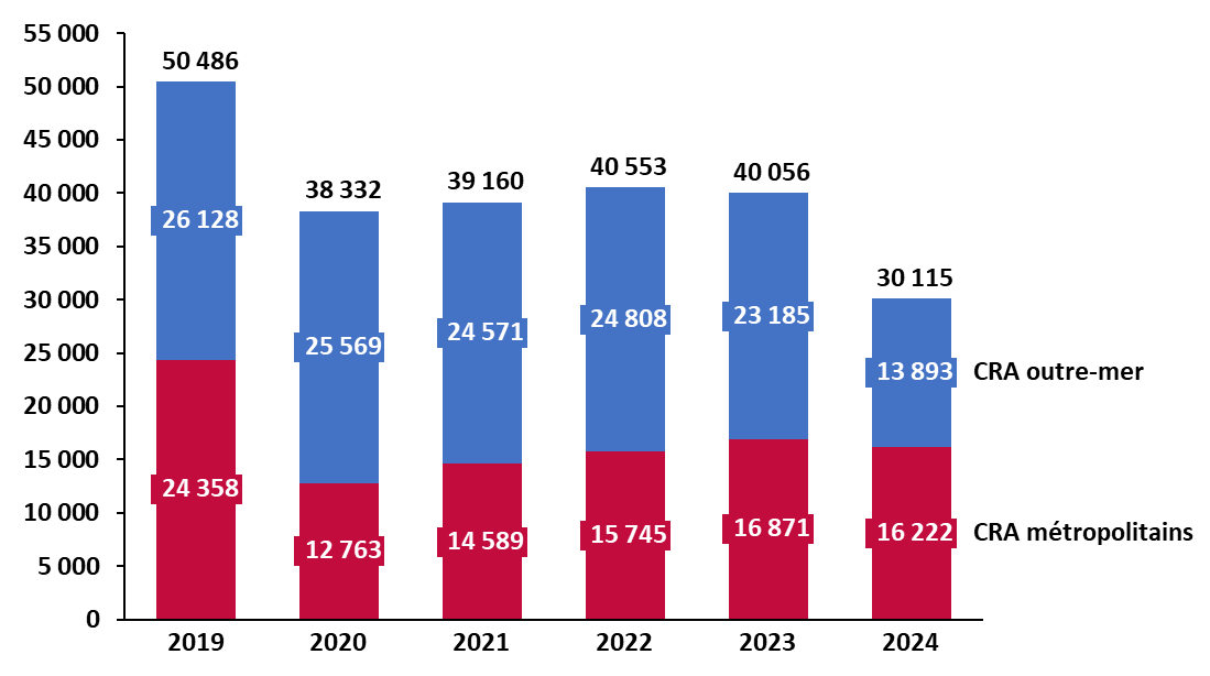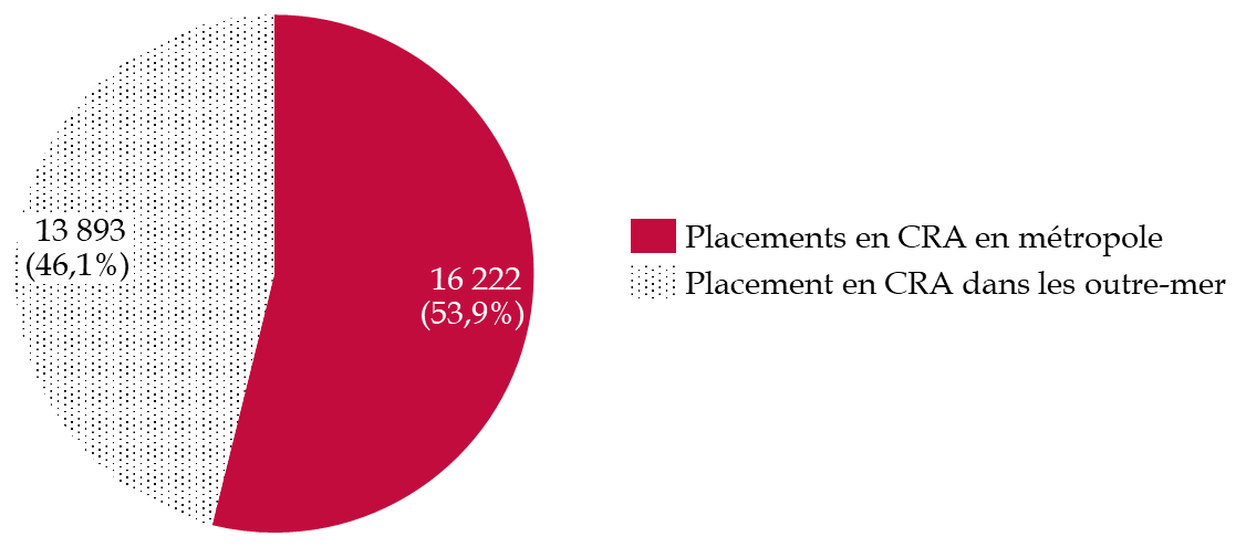 Le nombre de placements en CRA s'est établi à 30 115 en 2024, en réduction par rapport à la fin de la décennie 2010, sous l'effet principalement de la variabilité du nombre de placements dans les outre-mer. En 2024, 16 222 personnes ont été placées en CRA en métropole et 13 893 en outre-mer.