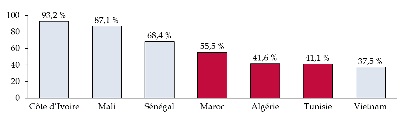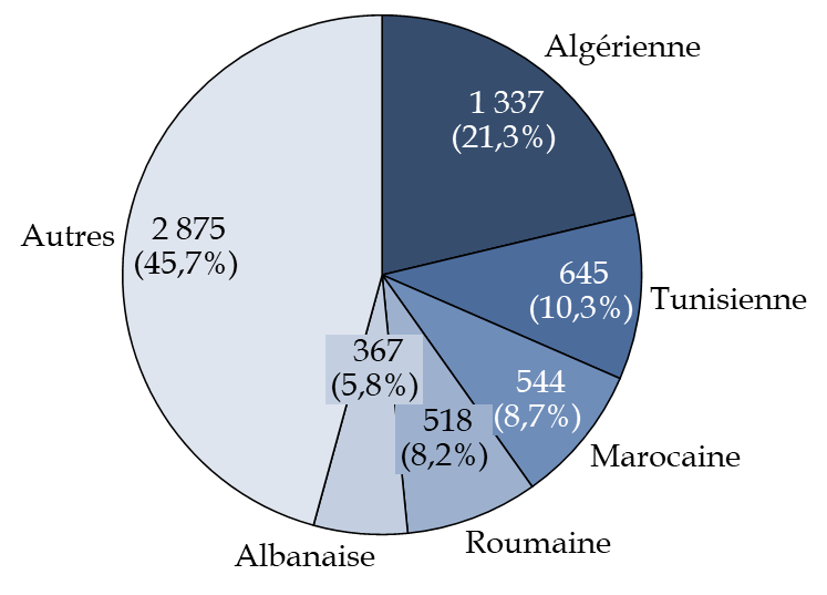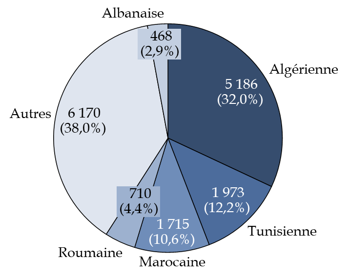 Les profils nationaux des retenus demeurent stables. En 2024, plus de la moitié des retenus en métropole étaient originaires du Maghreb (55 %), dont 32 % d'Algérie, 12 % de Tunisie et 11 % du Maroc.