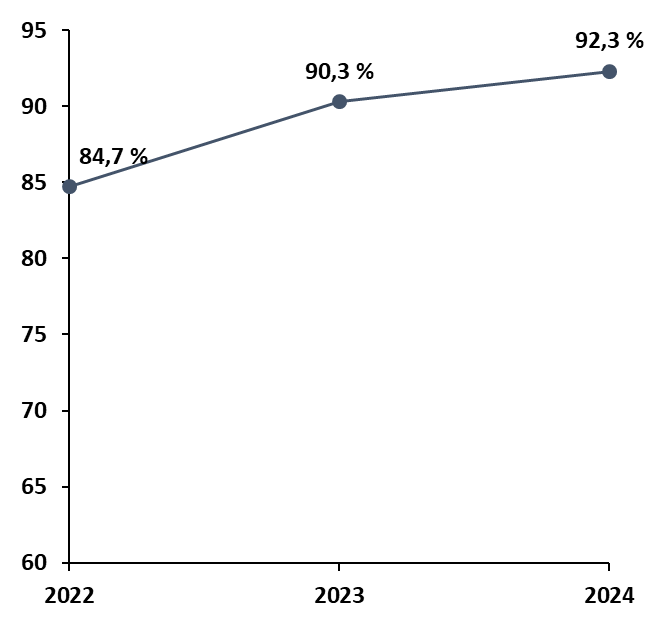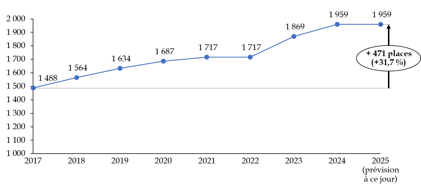 Depuis 2017, la capacité théorique du parc des CRA en métropole a progressé de 31,7 %, passant de 1 488 à 1 959 places, tandis que la sécurisation des sites a été nettement renforcée depuis 2022. La disponibilité réelle des places a par ailleurs augmenté (89,4 % en 2025). Sur 2 187 places théoriques, 1 956 étaient effectivement disponibles à la mi-mai 2025 (1 761 en métropole et 195 en outre-mer). Le taux d'occupation a quant à lui atteint 92,3 % en 2024 (70,8 % en 2017).