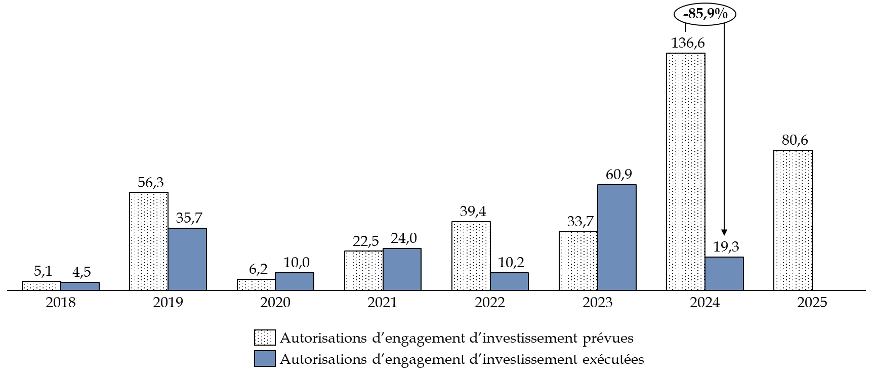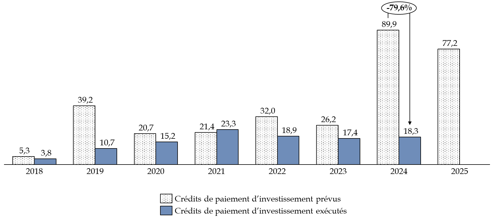 * 92 La granularité budgétaire ne permet pas d'isoler les dépenses d'investissement prévues et exécutées en faveur des seuls CRA. Cependant, ces derniers représentent la majorité des dépenses d'investissement dans les CRA, LRA et zones d'attente.