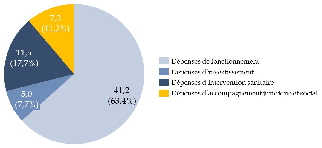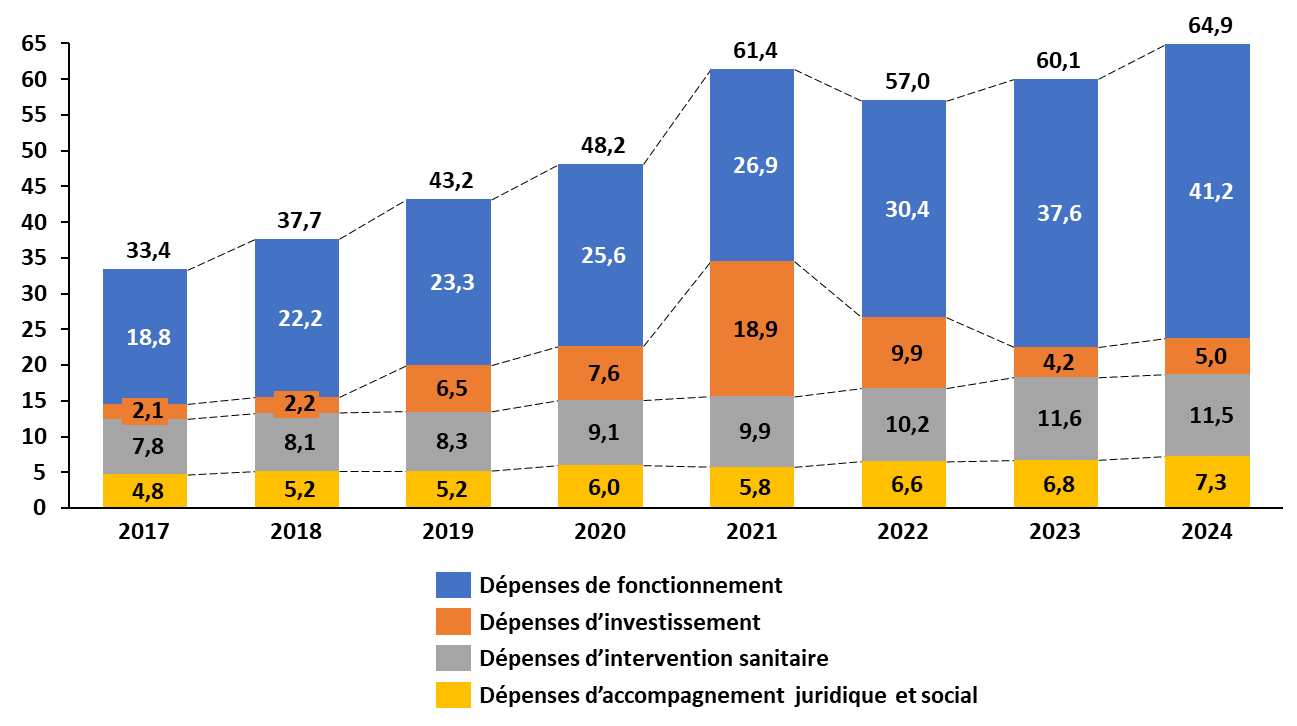 En 2024, le coût direct annuel de la rétention administrative (dépenses de fonctionnement, d'investissement et d'intervention sanitaire, juridique et sociale dans les centres et dépenses de personnel des forces de l'ordre) est estimé à 265 millions d'euros6(*). Le coût annuel des CRA imputé à la mission « Immigration, asile et intégration » est quant à lui passé de 33,4 millions d'euros en 2017 à 64,9 millions d'euros en 2024.