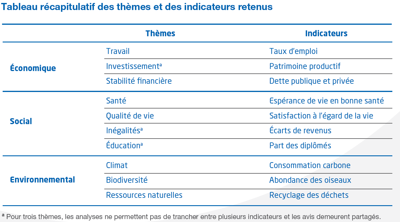 * 30 France Stratégie, Vincent Aussilloux, Julia Charrié, Matthieu Jeanneney, David Marguerit et Adélaïde Ploux-Chillès, « Au-delà du PIB, un tableau de bord pour la France », note d'analyse n° 32, juin 2015.