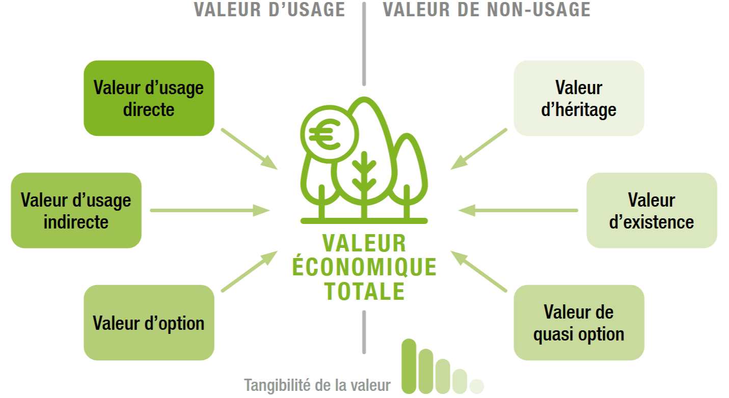 * 60 Valeur d'usage directe (bénéfices tirés des services d'approvisionnement) et indirecte (services dérivés tels la régulation), valeur d'existence (droit d'exister de la nature), valeur d'héritage (du legs aux générations futures), valeur d'option (prix à payer en vue d'un usage futur probable), valeur de quasi-option (valeur attendue de l'information découlant du fait de retarder l'exploitation et la conversion de l'écosystème).