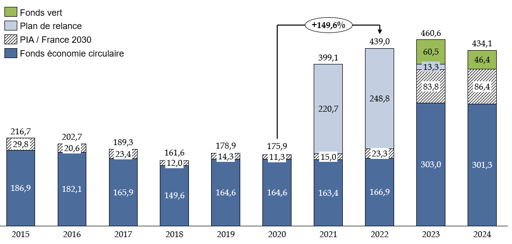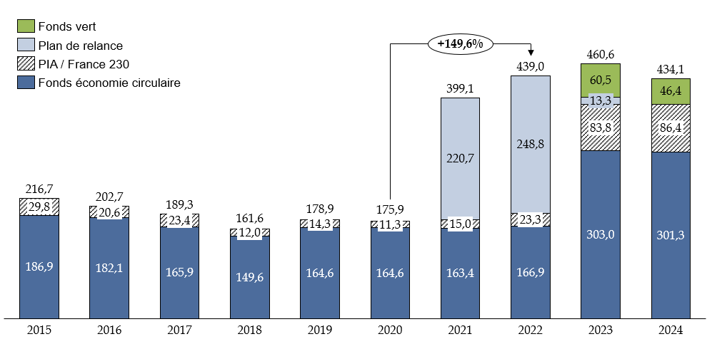 Les subventions de l'État, principalement à travers le fonds économie circulaire, ne sont pas censées recouper les domaines couverts par les filières. La création de nouvelles filières, et la montée en puissance de celles déjà existantes avec la loi Agec auraient donc dû en toute logique s'accompagner d'une diminution des subventions publiques, mais c'est le contraire qui a été observé sur les dernières années : les crédits consacrés à cette politique ont plus que doublé, passant de 175,9 millions d'euros en 2020 à 434,1 millions d'euros en 2024. Cette implication de l'État doit être interrogée.