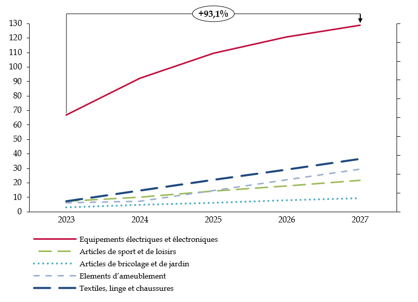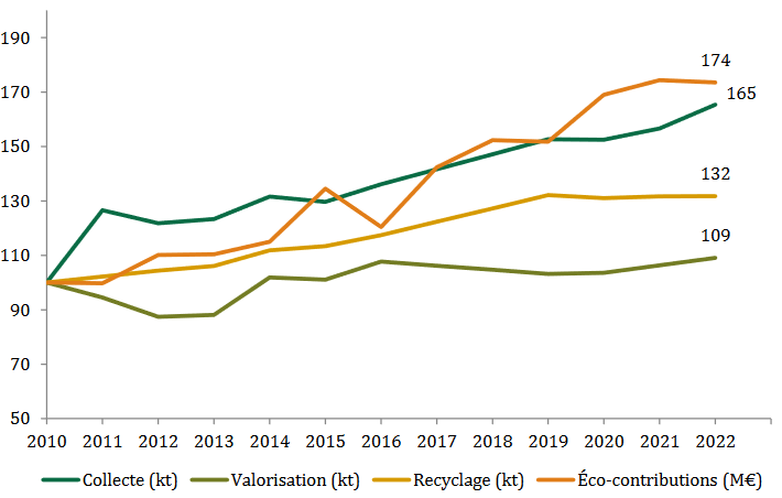 D'un côté, le poids économique des filières à responsabilité élargie du producteur (REP) devrait fortement augmenter dans les prochaines années : montant des éco-contributions collectées par les éco-organismes est passé de 1,9 milliard d'euros en 2022 à 2,3 milliards d'euros en 2024, et devrait atteindre 8 milliards d'euros en 2029.