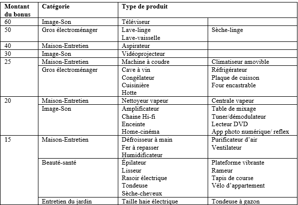 * 84 Les équipements électriques et électroniques ; les éléments d'ameublement, les produits rembourrés d'assise ou de couchage et les éléments de décoration textile ; les produits textiles d'habillement, les chaussures, le linge de maison neufs et les produits textiles neufs pour la maison ; les jouets ; les articles de sports et de loisir ; les articles de bricolage et de jardin.