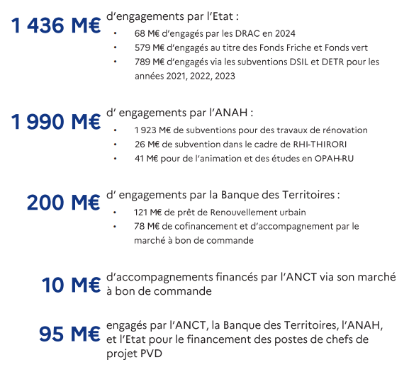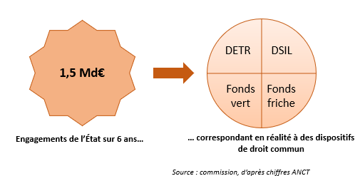 En premier lieu, cette enveloppe ne correspondait pas à des moyens supplémentaires affectés au dispositif mais à des dotations et fonds de droit commun - DETR, DSIL, fonds friche et fonds vert - lissés sur six ans, en ce qui concerne les 1,47 Md€ correspondant aux crédits engagés par l'État.