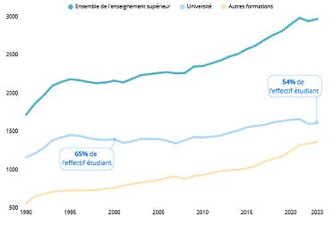 * 45 54,4 % des effectifs de l'enseignement supérieur en 2022, selon l'état de l'enseignement supérieur, de la recherche et de l'innovation (EESRI) publié par le ministère chargé de l'enseignement supérieur et de la recherche en 2025.