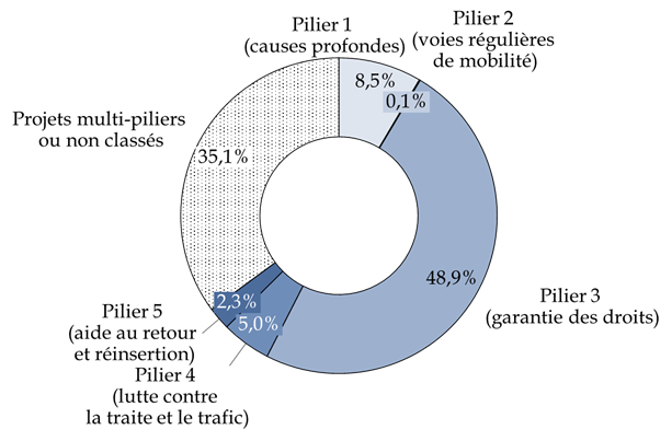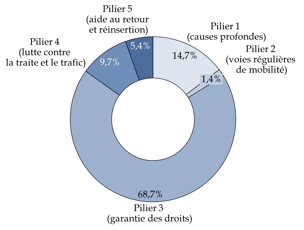 * 38 Un marqueur 1 est appliqué aux actions dont l'objectif principal et l'intégralité de la contribution financière visent le soutien à la migration et aux déplacements forcés et permet de comptabiliser 100 % du projet ; un marqueur 2 est appliqué aux actions dont le soutien à la migration et aux déplacements forcés constitue un enjeu conséquent et qui y consacre au moins un résultat et indicateur associé et permet de valider 40 % des financements.