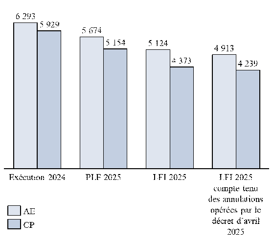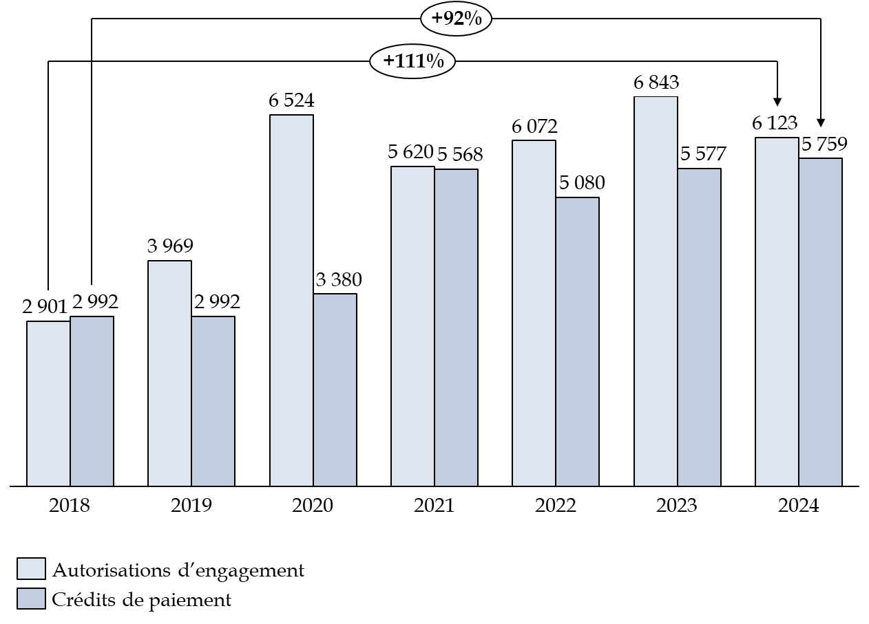 * 33 De 2018 à 2024, l'aide humanitaire de la France s'est distinguée par une hausse significative de ses moyens. Les crédits humanitaires ont été multipliés par 5,3 sur cette période, pour atteindre 895 millions d'euros en 2024. La loi de finances pour 2025 a néanmoins ramené ce total à 500 millions d'euros.