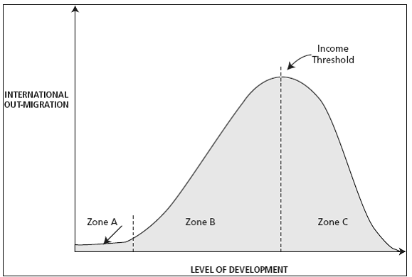 Une théorie ancienne, dite de la « bosse migratoire » (migration hump), identifie une relation positive, sous la forme d'une courbe en « U inversé », entre développement et migration et soutient, par conséquent, que l'aide au développement encourage les migrations à moyen terme. Cette analyse permet de soutenir que les pays à revenus intermédiaires présentent un potentiel migratoire plus important que les pays les moins avancés.
