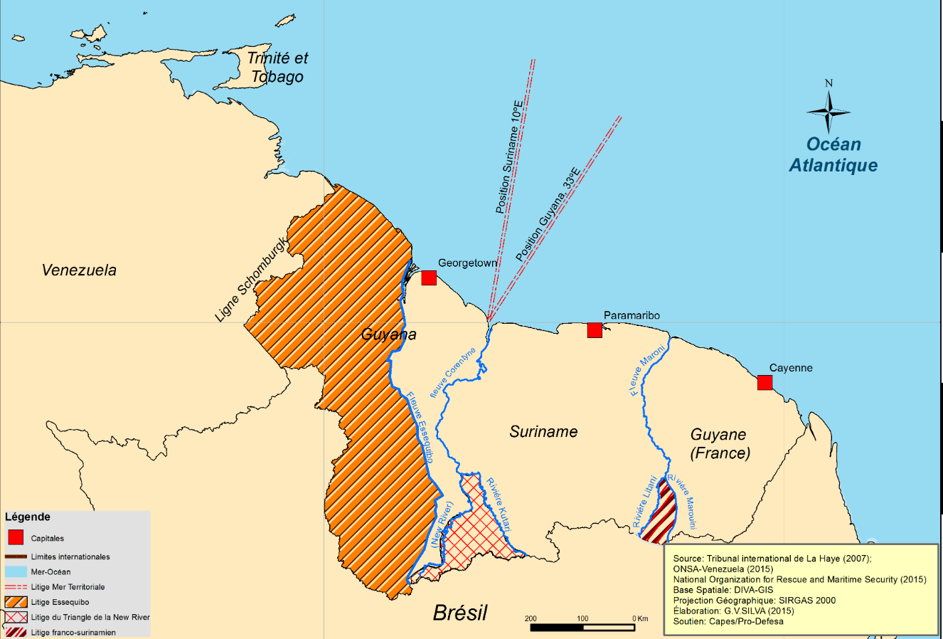 * 8 Le Venezuela a organisé le 3 décembre 2023 sur son seul territoire un référendum visant à annexer le territoire de l'Essequibo, revendiquant « les droits inaliénables du Venezuela et de son peuple sur le territoire d'Essequibo ». En mars 2024, le Venezuela adopte une loi qui désigne l'Essequibo en tant qu'État constitutif du Venezuela.