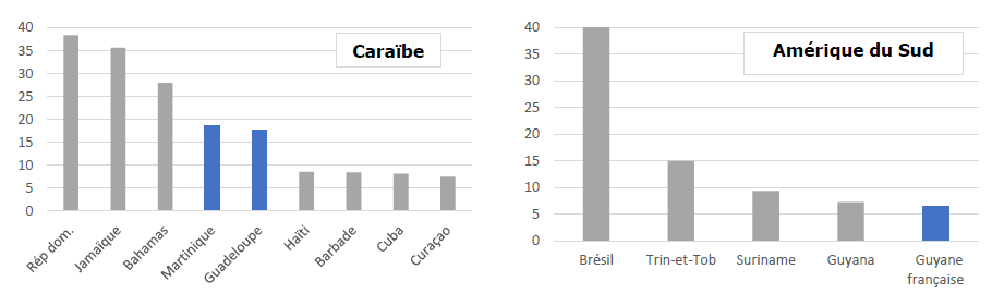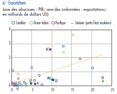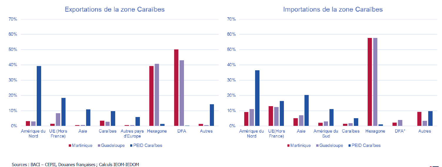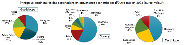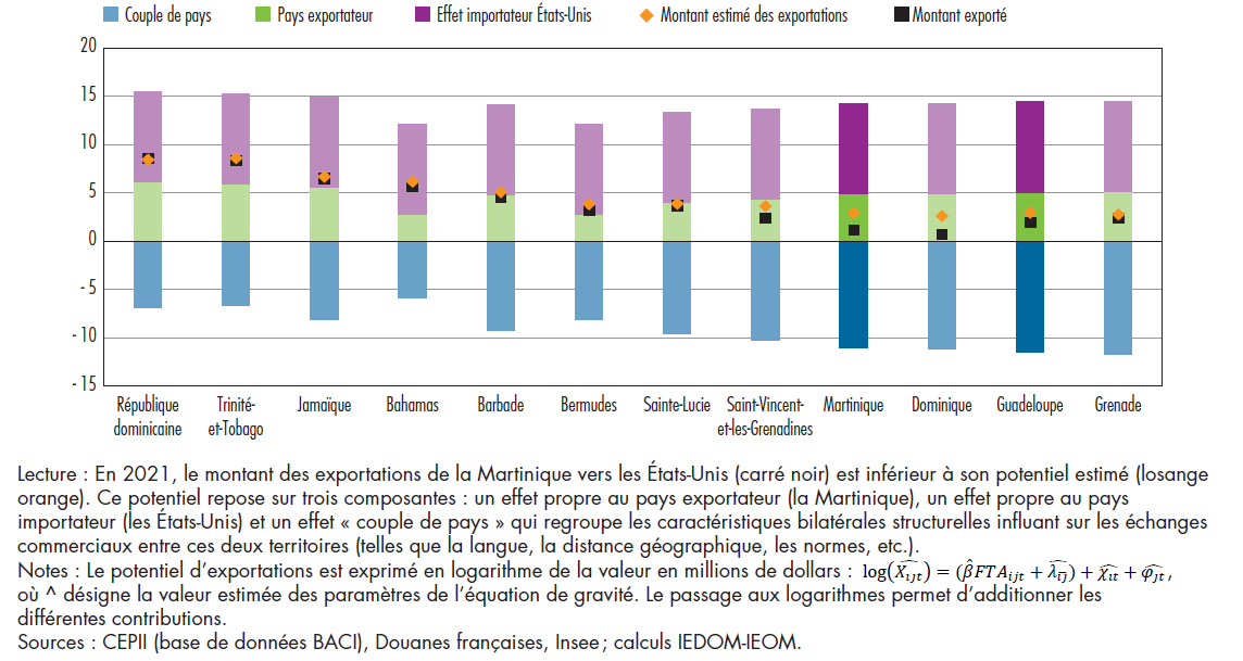 Entre 2013 et 2022, sur l'ensemble des exportations des territoires du bassin Caraïbes vers l'international, à l'exception de la Jamaïque et de la République dominicaine qui sont des cas particuliers, on constate que la Martinique, parce qu'elle exporte beaucoup d'hydrocarbures, et la Guadeloupe ont des niveaux d'exportation qui ne sont pas si faibles par rapport aux îles alentour, alors même que ces dernières exportent vers les États-Unis.