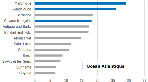 M. Manuel Marcias. - J'ai dû enlever de nombreux éléments pour respecter les critères de la Banque de France, mais à l'origine, nous parlions bien des éléments portuaires. Les outre-mer ont un indice de connectivité assez faible au niveau international. En revanche, à l'exception de Mayotte et de la Guyane, qui ont des ports plus petits, les infrastructures portuaires de nos Drom se situent plutôt bien dans l'environnement régional, entre les ports des petites économies et les grands ports régionaux. La Guadeloupe et la Martinique, par exemple, sont derrière la Jamaïque ou la République dominicaine, mais bien devant la Barbade.
