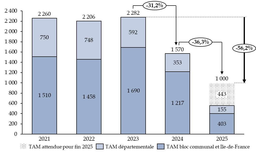 En 2023, le rendement de la taxe d'aménagement s'est établi à 2,3 milliards d'euros, dont 61 % pour le bloc communal, 36 % pour les départements et 3 % pour la région Île-de-France. Toutefois, ce rendement a fortement diminué depuis, chutant de 31 % en 2024 et - dans l'hypothèse d'un rendement d'un milliard d'euros en 2025 - de 56,2 % en deux ans.
